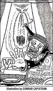 HECK YOUR WIFE at the door. Check your child at the door with your wife. This is for men only. Come in and see Vulvina! Now, you must ask her all the questions you want. Vulvina will answer all your sex questions. Now ... step right up. Tickets are only five dollars apiece. It's your one and only time to see Vulvina. Check your wife and child at the door. Come back, ladies ... come back, ladies. In an hour or two, Vulvina will have answered all his questions. Now, if you have any questions you wanna ask Vulvina, write them out and hand them to him. He will give them to Vulvina!Now, at the end of this show -- at the end of this show, Vulvina will do something that no one has ever done before. And don't ask your husband until you get home and in bed tonight, ladies. Maybe you can do it! Hee-hee-heeee.