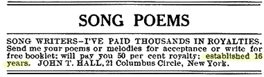 In 1909 Hall, a New Yorker, filed for bankruptcy, declaring liabilities of $4,867 and assets of $0. At the time he was operating John T. Hall Music Publishing; it's not clear whether this was a legitimate publishing company or a song-poem gambit, but clues in his bankruptcy filing lean toward the latter. He was back on his feet a few years later, forming the Knickerbocker Harmony Studios, undoubtedly a song-poem service. (In trying to fix the time of Hall's drift into song-poem music, another possibility is that he only turned to sharking following his bankruptcy, as a last-ditch solution to the hard times upon which he had fallen. If this is the case, then perhaps the "16 years" mentioned in the ad above refers to his length of service in the music industry in total, rather than the duration of his song-poem enterprise.)