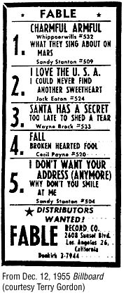 Most of the information we have on Fable was provided by Terry Gordon, who compiled it by pouring through crinkly old issues of Billboard. His yeoman efforts and dwindling eyesight on our behalf are extremely appreciated. Terry's interest in Fable stems from its growing reputation as a not-half-bad rockabilly label, particularly their earlier efforts. As their release numbers progress and titles like "Teenie Weenie Man," "Teen Age Brain Surgeon" and "The Happy Hop" start to appear, Fable's shift from bop to schlock becomes quite evident.