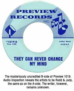 1019: Rodd & Judy -- Santa Fix My Toys For Christmas (Helen Bereza) / no artist credited (though sounds like Rodd & Judy) -- They Can Never Change My Mind (no writer credited)